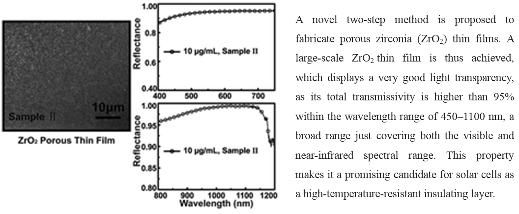近日,我院欧阳方平教授课题组在多孔ZrO2及透明薄膜制备等方面的研究取得新进展,报道了一种高比表面积(≥162 m2·g-1)多孔ZrO2及其透明薄膜(可见-红外区域透过率大于95%)的制备方法与光学性质,此研究成果发表在国际学术期刊RSC Advances。我院本科生应物11级李奥林、应物12级李怡格、光电13级李俊飞同学在陈羽老师和欧阳方平老师的指导下分担了研究中的实验制备、性能测试与计算模拟工作。并发表论文:Yu Chen*, Aolin Li, Yige Li, Junfei Li, Guo Zhang Dai, Fangping Ouyang*, Xiang Xiong, “High Transparent Porous ZrO2 Thin Films: Fabrication And Optical Properties”, RSC Adv., 2015(5) : 35929-35933, IF=3.708。