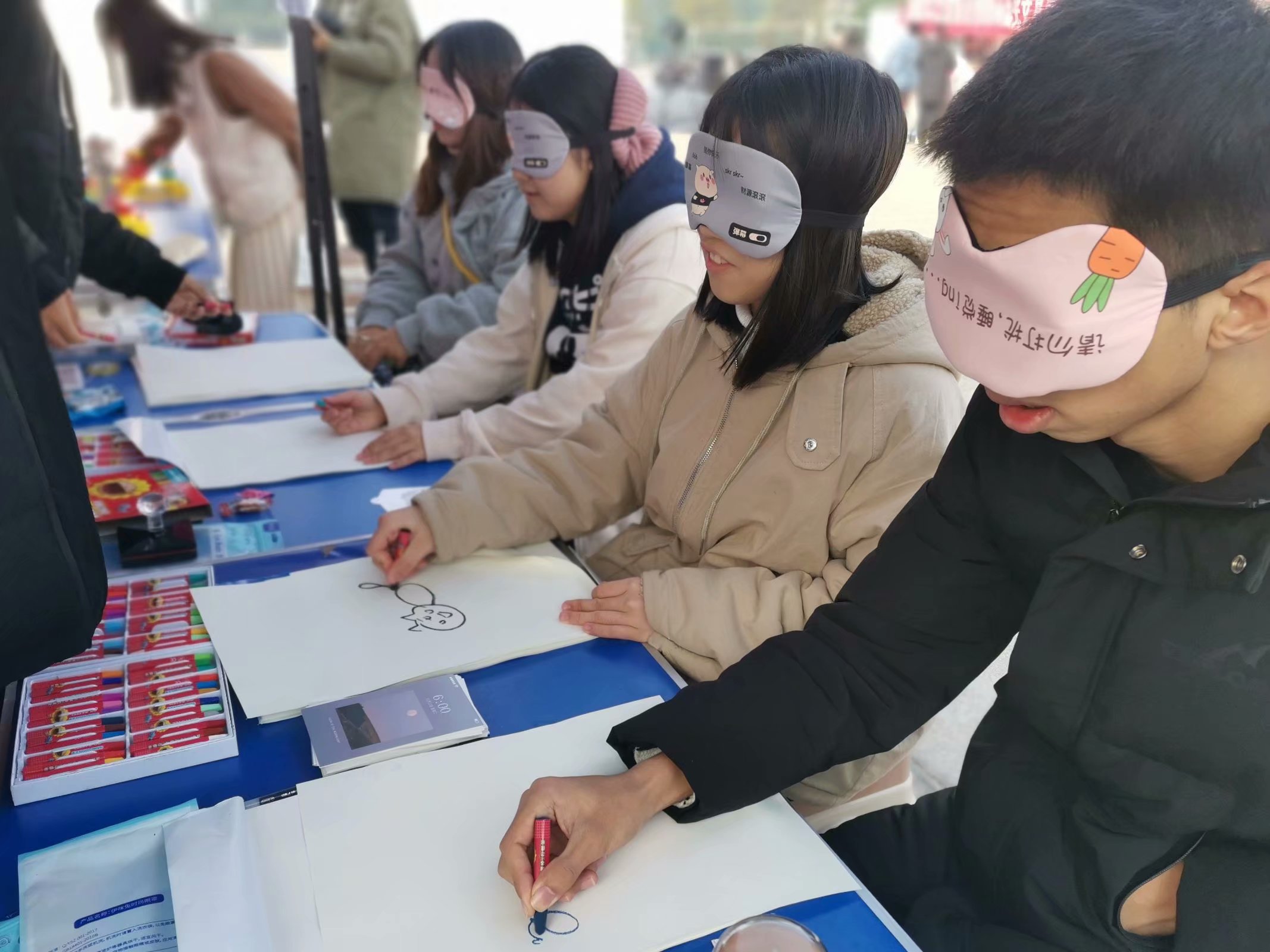 在本次游园会活动中,四院联合心助会总计开展了四个游戏项目:共解心结,两人搭档合作,共同解除一组较为复杂的绳结,旨在以解绳结来除心结;妙趣横生,两方按动按钮,操纵小人相互敲击,直至一方小人受到攻击而弹出,于小游戏中体验互动乐趣;“心”画手“谈”,参与者被蒙上眼睛,根据工作人员的要求,用画笔绘制心中的“图像”,让心与手真正相应;情寄纸笺,参加的同学被要求与不同的陌生人相互拥抱,在这个过程中,拥抱让同学们重拾童年的安全感、温暖感,甚至在陌生人之间都燃起了一股暖意,融化了心灵的坚冰。