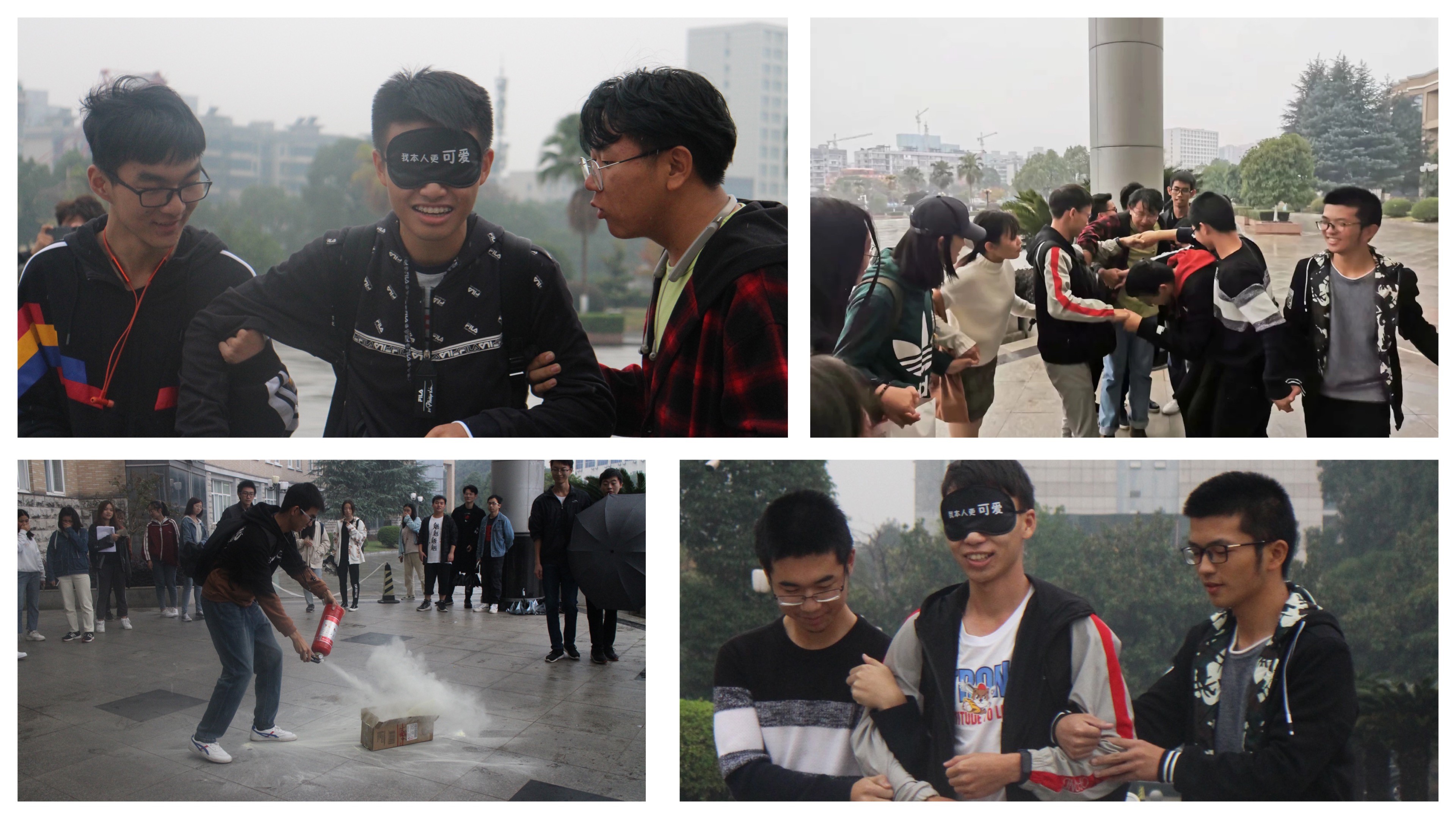 室内活动结束后,开始了室外活动。室外活动分为四个部分,模拟运送伤员、寻找校园里的消防栓、解同心圆以及示范使用灭火器。同学们在活动中释放自我,积极参与,在校园中许多意想不到的位置找到了消防栓,在集体的努力下解开复杂的同心圆,增强了集体合作力。
