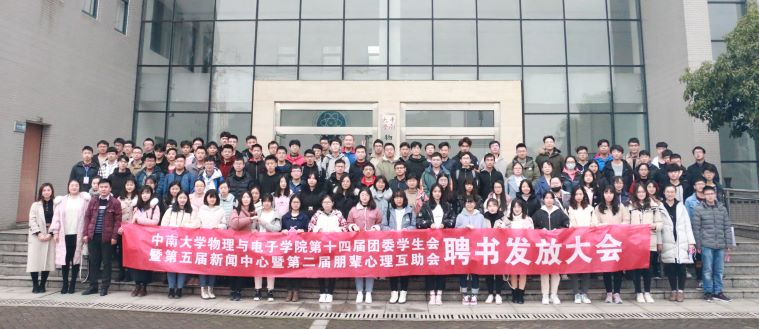3月9日上午,物电院学生干部聘书发放大会在物理楼116报告厅顺利举行。分团委书记杨凌云,辅导员胡菁菁、肖佳珣,及本届团委学生会、新闻中心、朋辈心理互助会全体成员参与了此次会议。会议由学生干部赵雪主持。