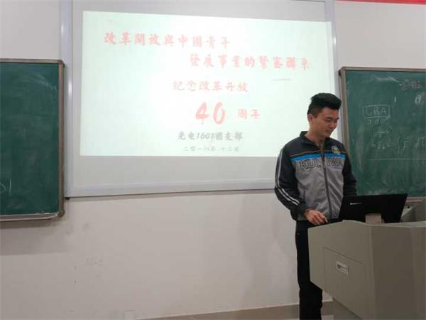 在团课上,光电1601团支部组织学习了共青团中央书记处第一书记贺军科同志的文章《在改革开放进程中阔步前进的中国青年发展事业》,同时观看了改革开放40年来中国社会变化纪录片,对40年的历程进行回顾,向改革开放致以敬意。最后,还学习了规划与指导青年发展的《中长期青年发展规划(2016—2025年)》文件。