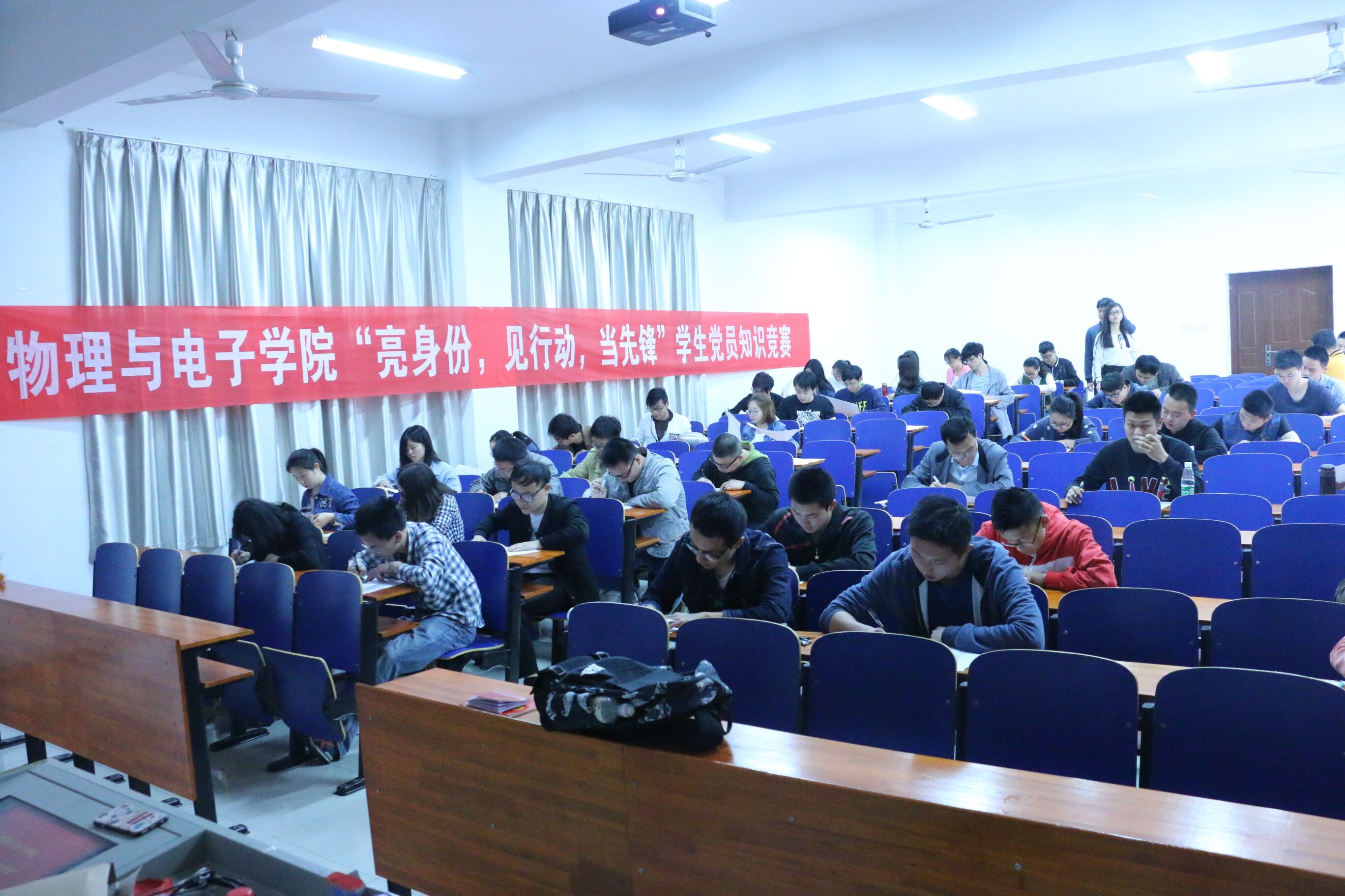 为提高学生党员的思想认识,充分发挥党员先锋模范作用,4月8日上午,物理与电子william威廉亚洲官方在物理楼123、124、125教室开展了以“亮身份,见行动,当先锋”为主题的党员知识竞赛。