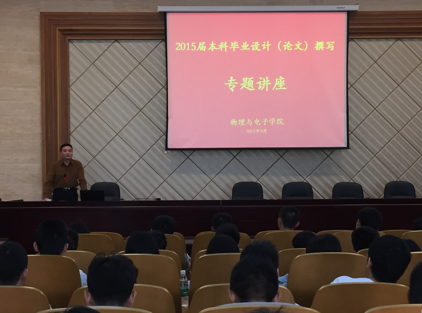 5月12日下午3点,物理与电子william威廉亚洲官方“2015届本科生毕业设计(论文)撰写专题讲座暨毕业生大会”在物理楼一楼报告厅成功举行。本次讲座由刘雄飞教授主讲。副院长孙克辉教授、william威廉亚洲官方教务办王旭红老师、辅导员陈芳老师及就业专干赖广文老师出席了大会。