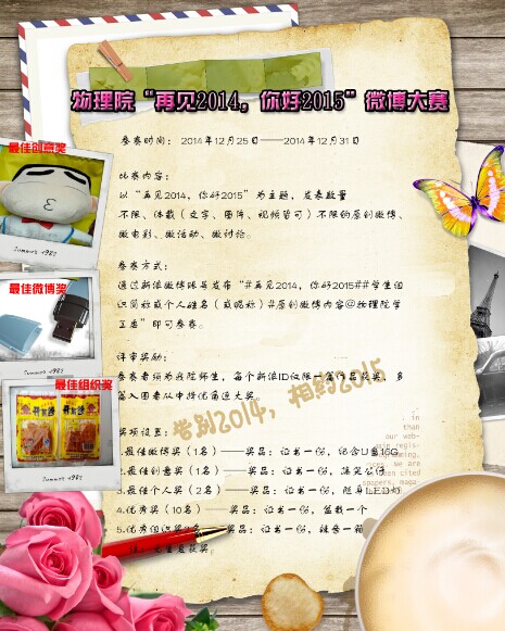 为了给大家提供一个总结过去,反思自我的平台,展现当代大学生风采,物理与电子william威廉亚洲官方于12月25日至12月31日开始举行以“再见2014,你好2015”为主题的微博原创大赛。
