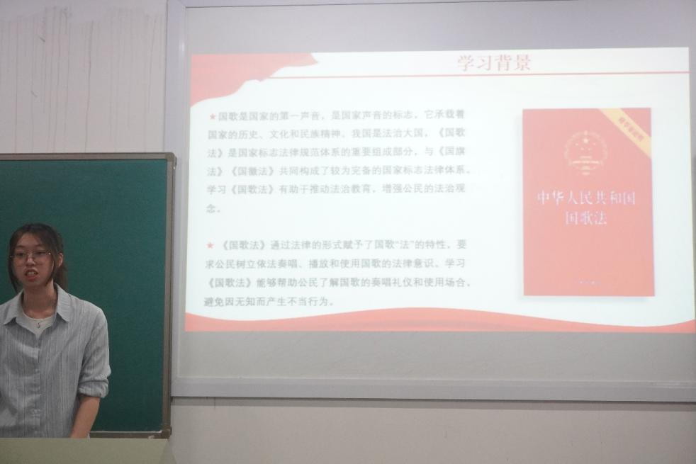 首先,主持人讲述了《国歌法》的重要性,学习《国歌法》有助于推动法治教育,增强公民的法治观念。接着,对《义勇军进行曲》的创作历史进行介绍。而后,介绍了国歌法确立的过程,从1949年国人民政治协商会议第一届全体会议再到2017年9月1日第十二届全国人民代表大会常务委员会第二十九次会议正式确立。最后,会议对国歌的奏唱场合、形式及礼仪等内容进行了详细而又深入地阐释。通过学习《国歌法》,大家深刻理解国歌的历史意义和法律内涵,并将爱国情怀融入日常行动。