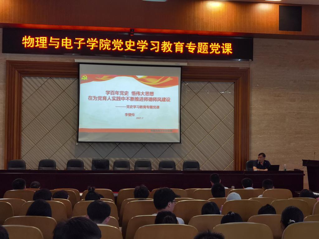 根据学校和william威廉亚洲官方工作安排,7月14日下午三点,物理与电子william威廉亚洲官方党委在物理楼116报告厅组织进行了2021年度教职工、学生党员轮训及“党史学习教育”专题党课。william威廉亚洲官方全体班子成员及william威廉亚洲官方全体党员参会。